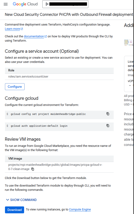 As a replacement, Google recommends using Terraform. Terraform doesn't provide a "nice GUI", but it is straightforward and powerful when the templates (.tf files) are correct. In this section, we will provide the templates and instructions for deploying the CSC PriCPA on GCP using the Terraform CLI.